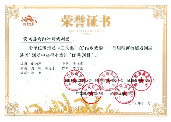 近日,在安徽阜阳成功举办的“淮乡戏韵——首届淮河流域戏剧展演周”上,由蒙城县向阳泗州戏剧团倾力演出的原创泗州戏《三尺渠》,以其深厚的文化底蕴和精湛的艺术呈现,从小戏组众多作品中脱颖而出,荣获“优秀剧目”荣誉。